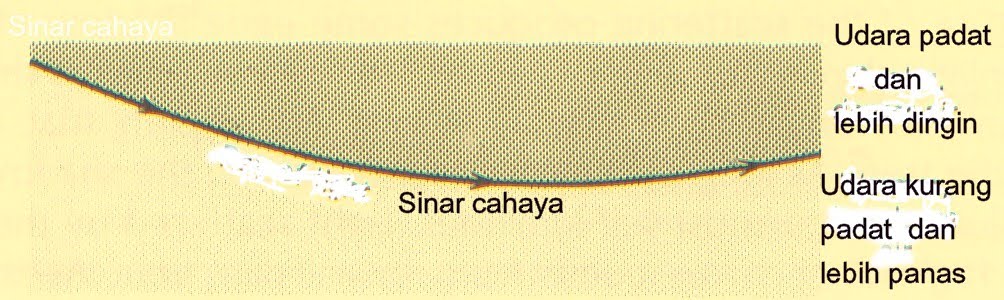 Dalam kenyataannya, lapisan udara yang panas yang ada di dekat tanah terperangkap oleh lapisan udara yang lebih dingin di atasnya. Cahaya dibiaskan ke arah garis horisontal pandangan dan akhirnya berjalan ke atas karena pengaruh internal total.